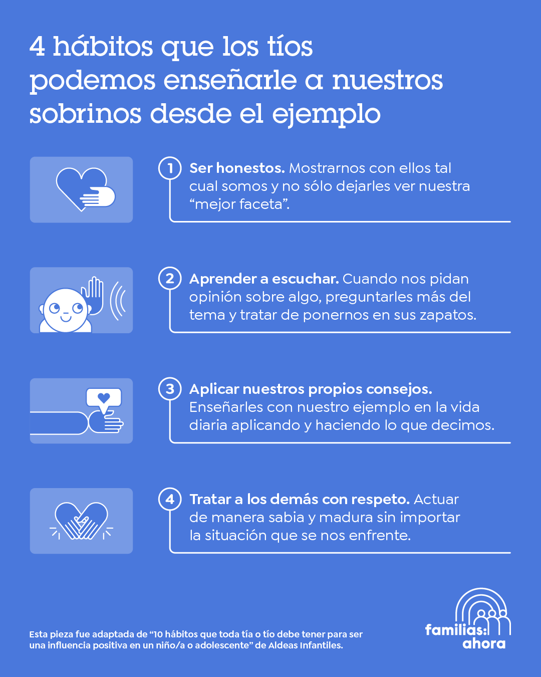 Los adultos, sin duda, somos ejemplos a seguir de los niños y niñas. Si somos cercanos a ellos, en este caso sus tíos o tías, llevamos una gran responsabilidad pues tenemos la labor de enseñarles valores que les permitan convivir en bienestar con los demás. Por eso, te compartimos 4 hábitos que podemos implementar como tíos para que nuestros sobrinos aprendan y apliquen en su vida diaria.