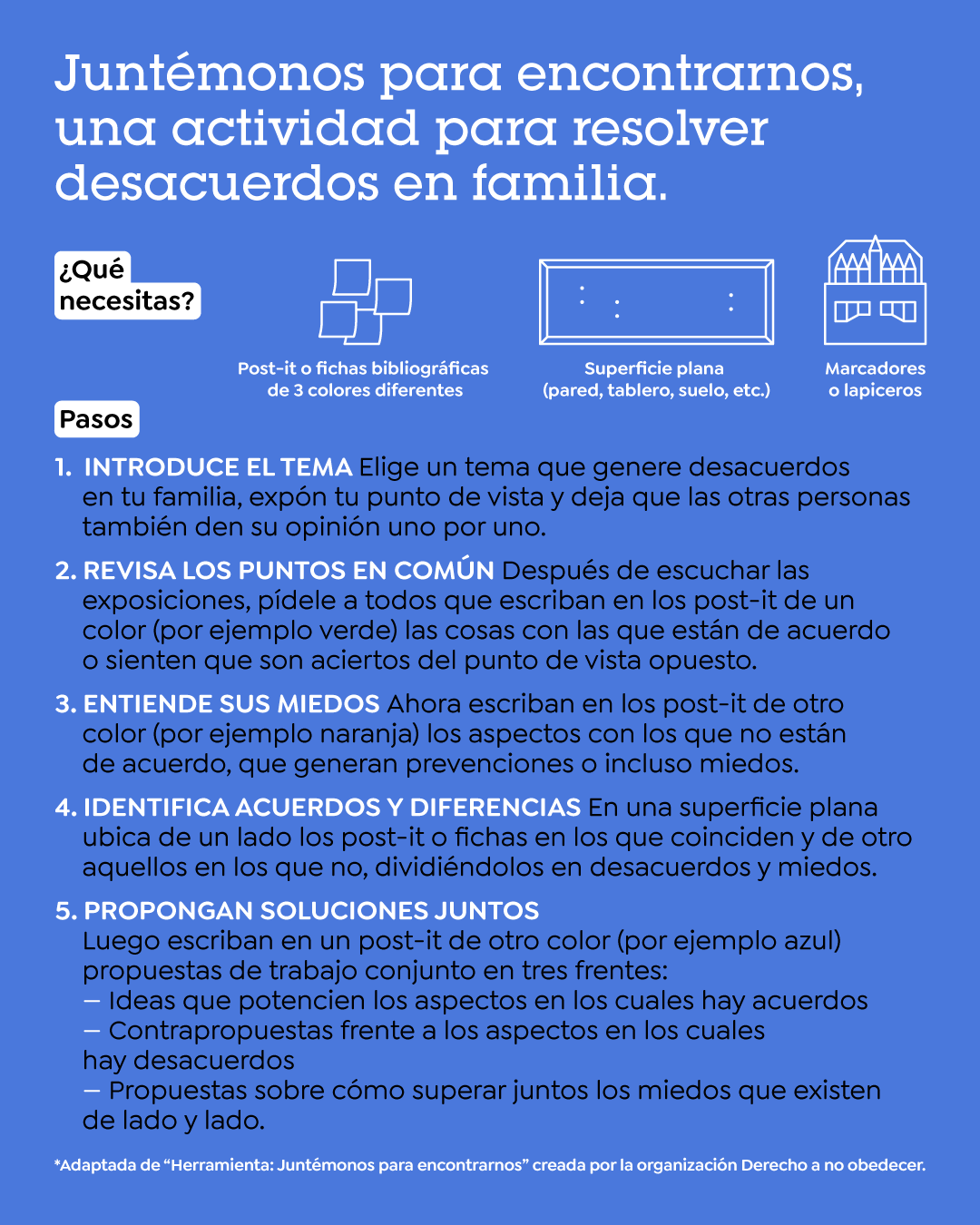 En «Familias: Ahora» promovemos un compromiso de las familias para fomentar la convivencia y la solución pacífica de conflictos, pero entendemos lo difícil que puede ser tener una conversación cuando todos en la familia tienen miradas muy diferentes frente a un tema o situación particular.