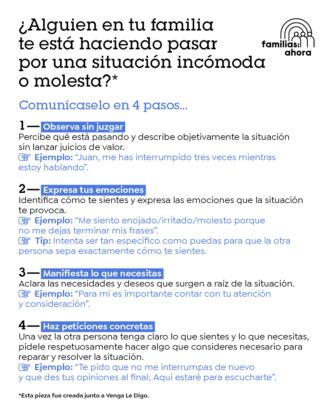 Es normal que en nuestras relaciones familiares vivamos situaciones incómodas o desagradables, pero eso no significa que estas deban escalar al conflicto o que debamos evitar una discusión. La forma en que expresamos nuestras emociones, la manera en que comunicamos nuestras necesidades y hacemos solicitudes a los demás, marca la diferencia por completo.