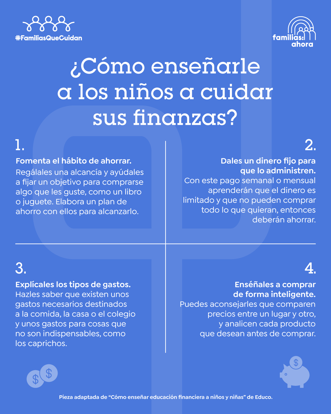 Es importante que los niños y niñas de nuestra familia aprendan a ahorrar y cuidar sus gastos, así podrán tener una mayor autonomía a medida que crezcan y tomarán decisiones responsables sobre sus proyectos de vida. Como los adultos de la familia, es importante cuidar y educar a los más pequeños. Las #FamiliasQueCuidan siguen estos consejos para ayudarse entre sí.
