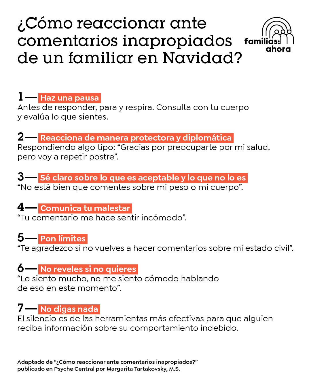 En “Familias: Ahora” queremos brindarle herramientas a todas las personas para que puedan nutrir y construir conversaciones saludables con sus seres queridos, por eso les compartimos esta guía para sobrellevar los apuntes imprudentes de la familia en esta temporada navideña.