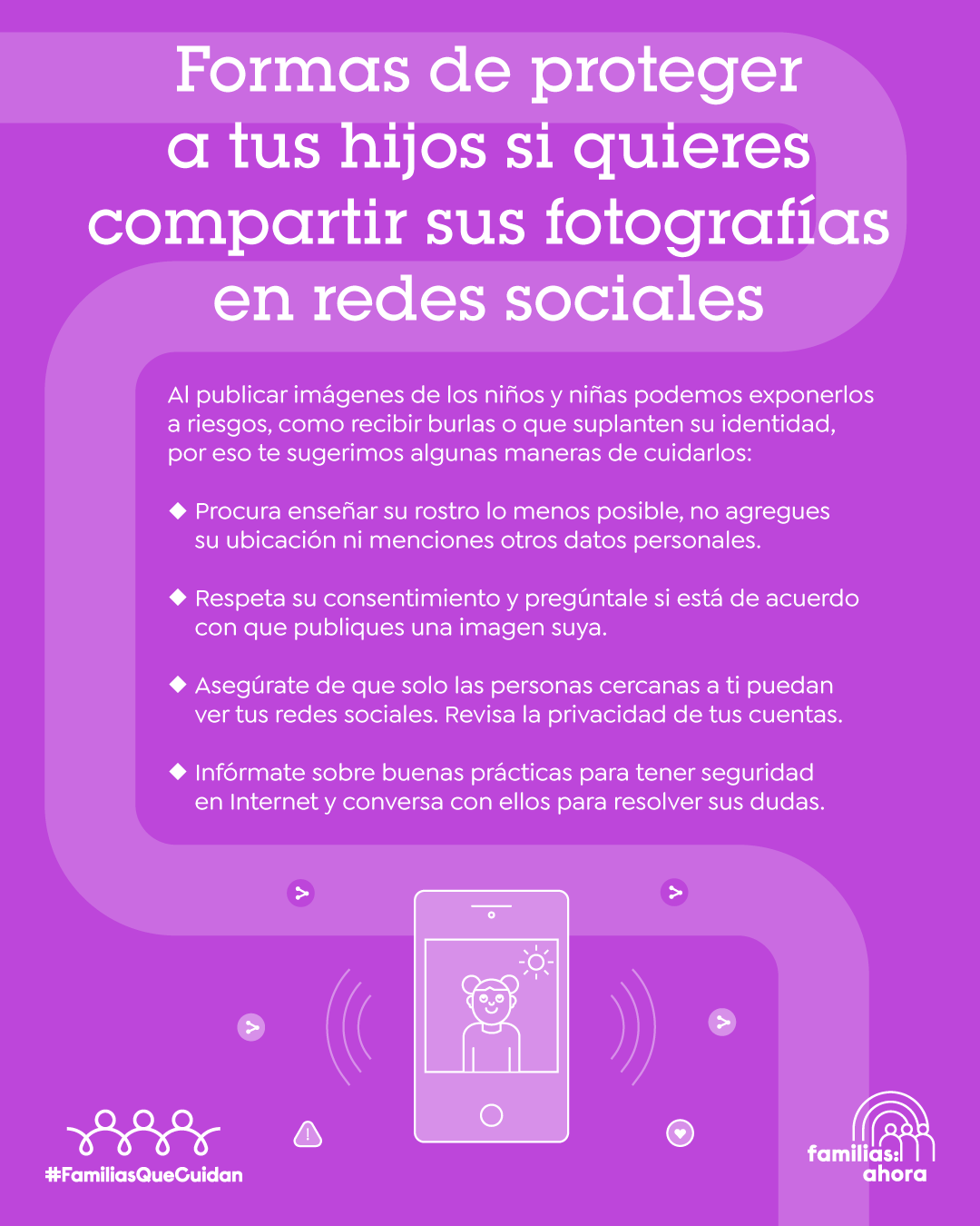 A veces normalizamos compartir fotos y datos privados de nuestros hijos, pero es importante que respetemos su consentimiento y adoptemos medidas de cuidado para compartir fotos familiares. Las #FamiliasQueCuidan siguen estas recomendaciones para crear ambientes de protección.