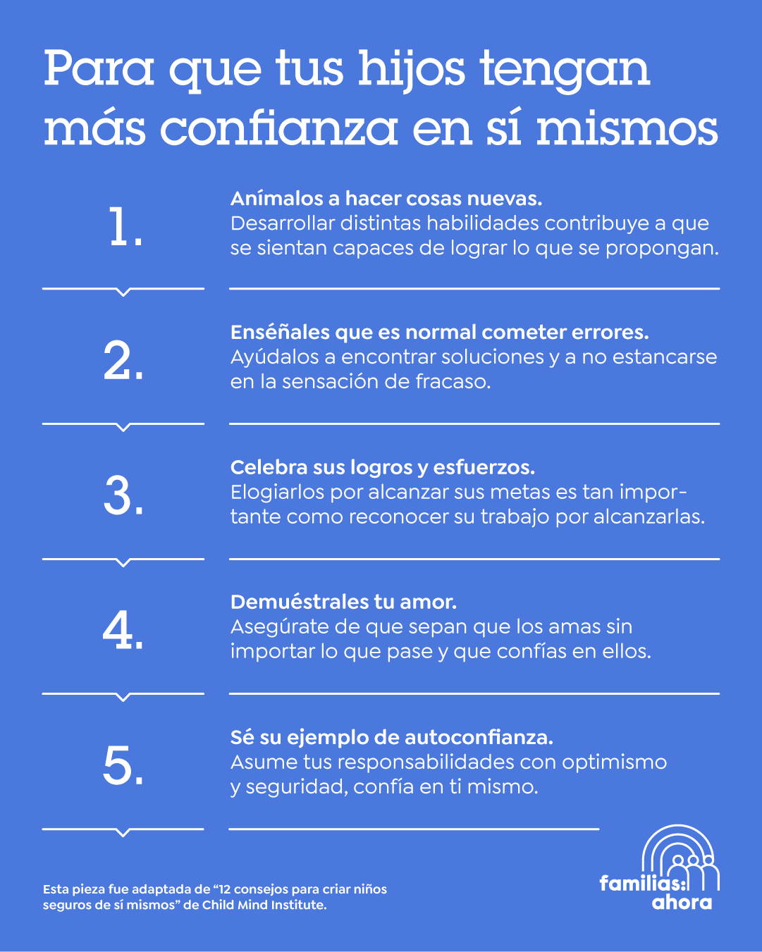 Durante su crecimiento, los niños y las niñas necesitan aprender a confiar en sus capacidades y saber recuperarse del fracaso cuando las cosas no salen como quieren. Por eso, te traemos 5 consejos para brindarle herramientas a tus hijos para que se sientan más seguros en su día a día.